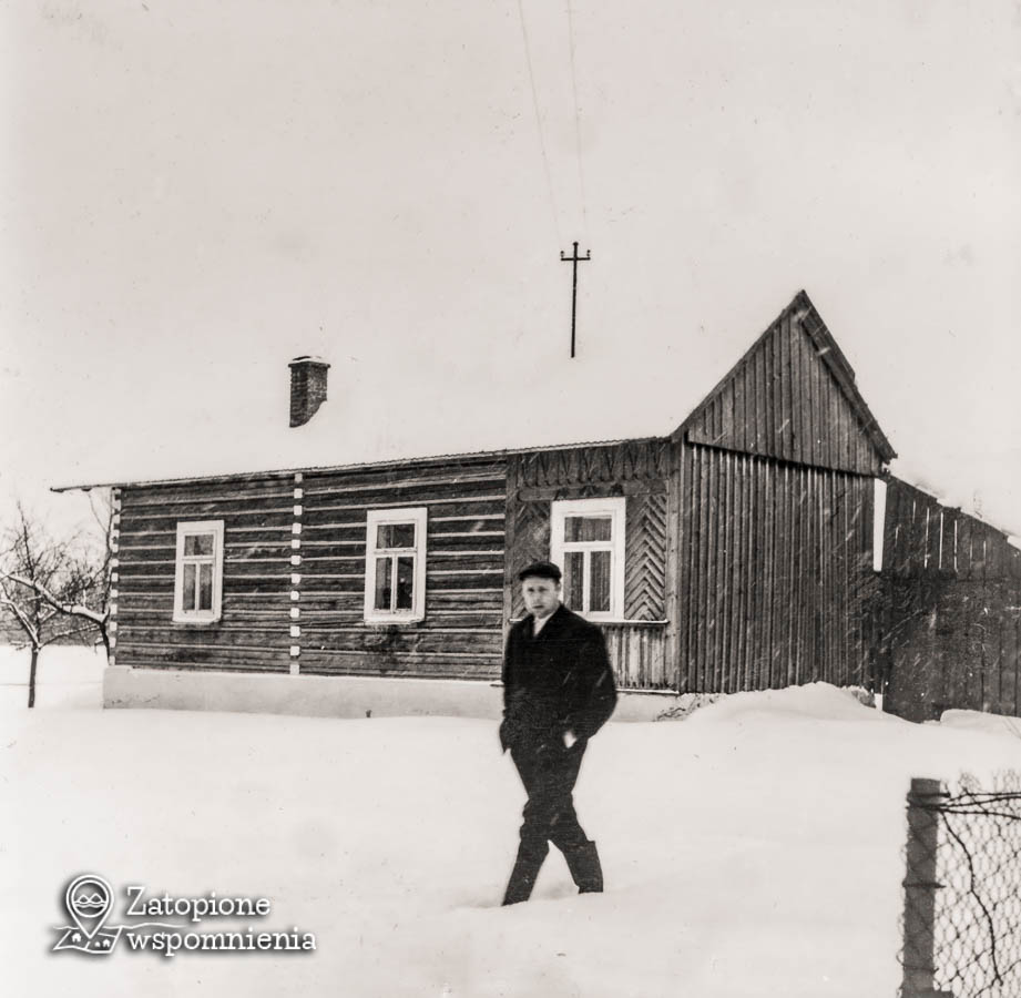 Podpiwniczony dom drewniany z 1950 roku, dwie izby na jednej kondygnacji. Przy domu stodoła ze stajnią, szopa i studnia. Na zdjęciu Andrzej Plewa, syn Jana, mieszkał obok.